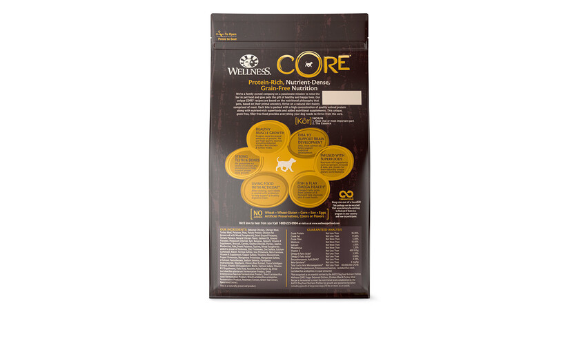 Wellness CORE dry foods are all GMO-free, grain-free, naturally preserved and contain only whole foods with no fillers, corn, wheat, soy by-products, preservatives or artificial ingredients.