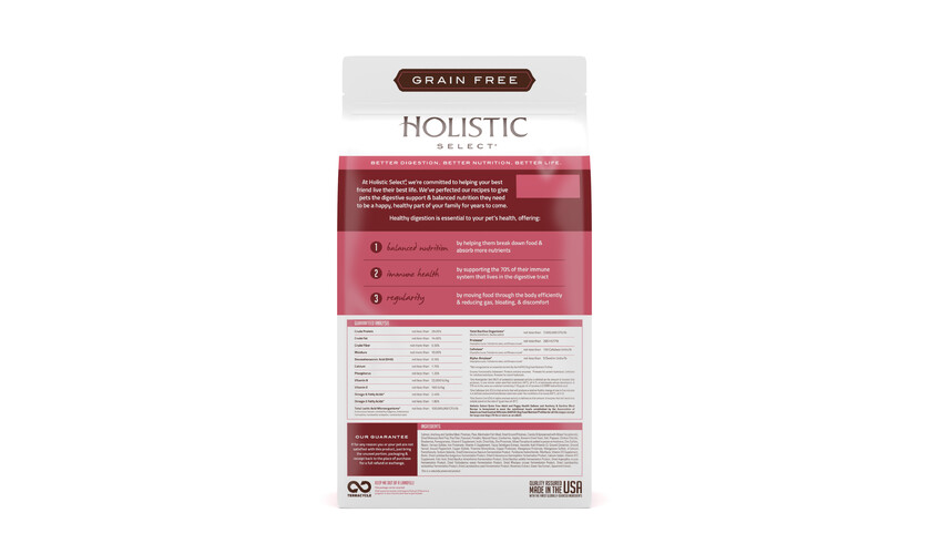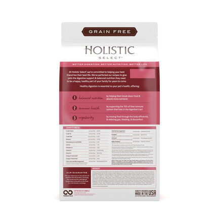 Like all the other pet foods on Pure and Wholesome, Holistic Select dog food is 100% natural and uses only the highest quality natural ingredients. It is different to other brands however because of its emphasis on digestion. Its proprietary digestive health support system includes dietary fibre, prebiotics, 100 million probiotics per 450g of food, yoghurt cultures, digestive enzymes and natural herbs and botanicals.